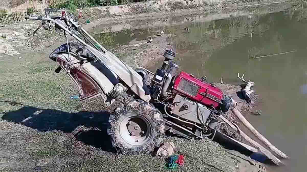 The driver lost control of the power tiller while attempting to navigate a slope near the bank of a fish pond. In a desperate attempt to regain control, Laskar became disoriented, and his foot inadvertently got caught in the running rotary plow (tiller blades).