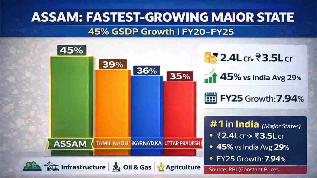 Guwahati: In a historic economic shift, Assam has been recognized as the fastest-growing major state economy in India. According to the latest data released by the Reserve Bank of India (RBI) in late December 2025, Assam recorded a staggering 45% growth in its Gross State Domestic Product (GSDP) at constant prices over the last five fiscal years (FY20–FY25).